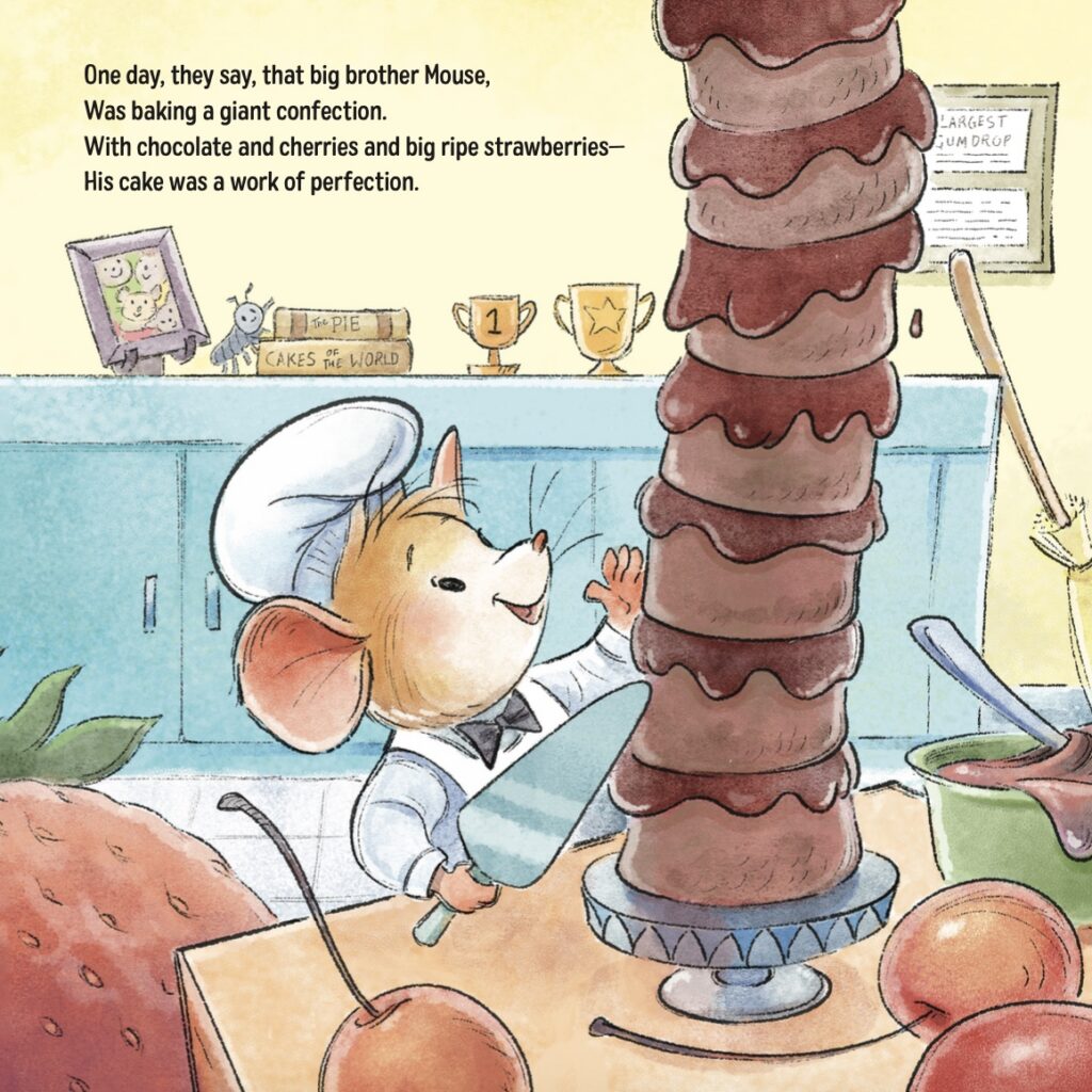 You’ll follow big brother Mouse as he tries (desperately) to bake the perfect dessert, only to be interrupted again and again by his energetic and clumsy little brother, Moose. No matter what Mouse does, disaster seems to strike whenever Moose is around. But in the end, Mouse learns something really important—life is better when it’s shared, mess and all.